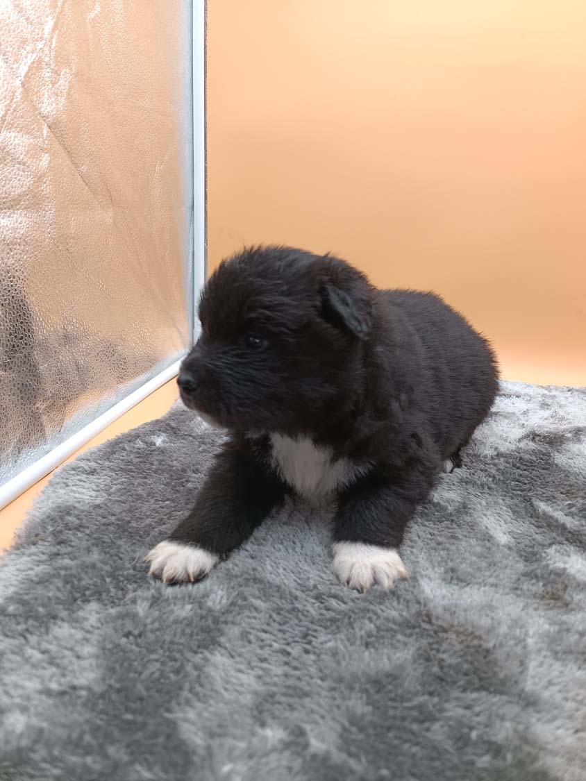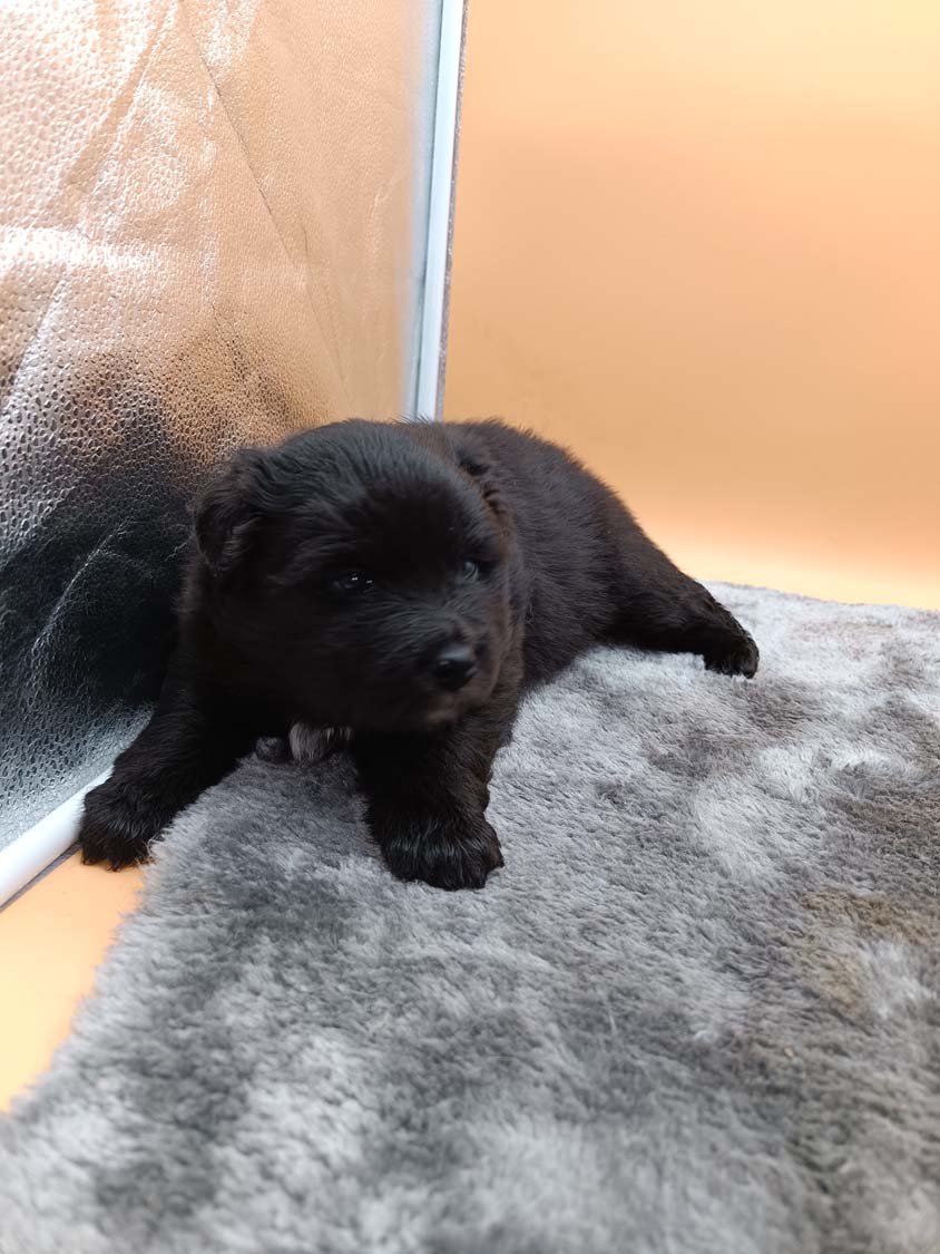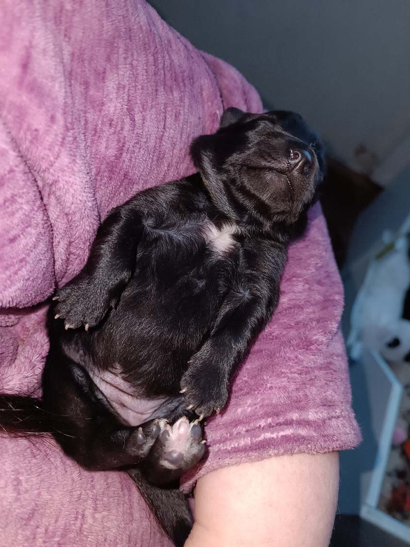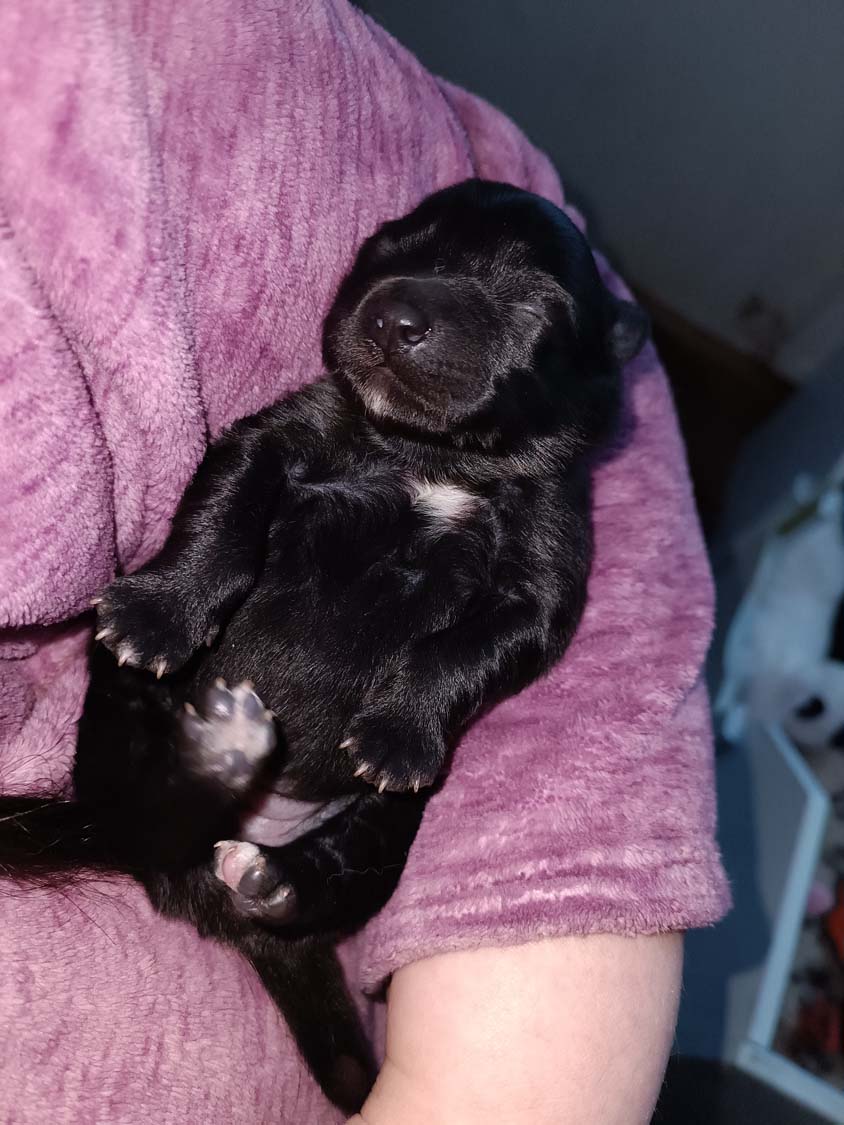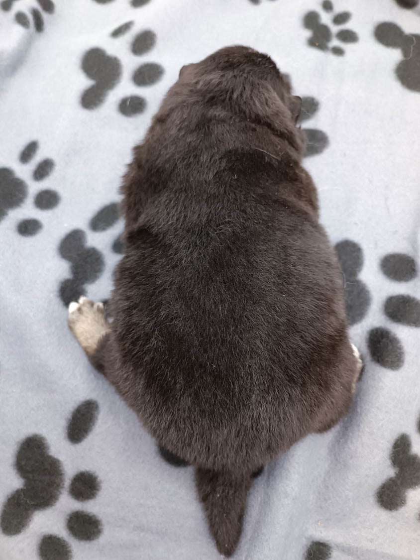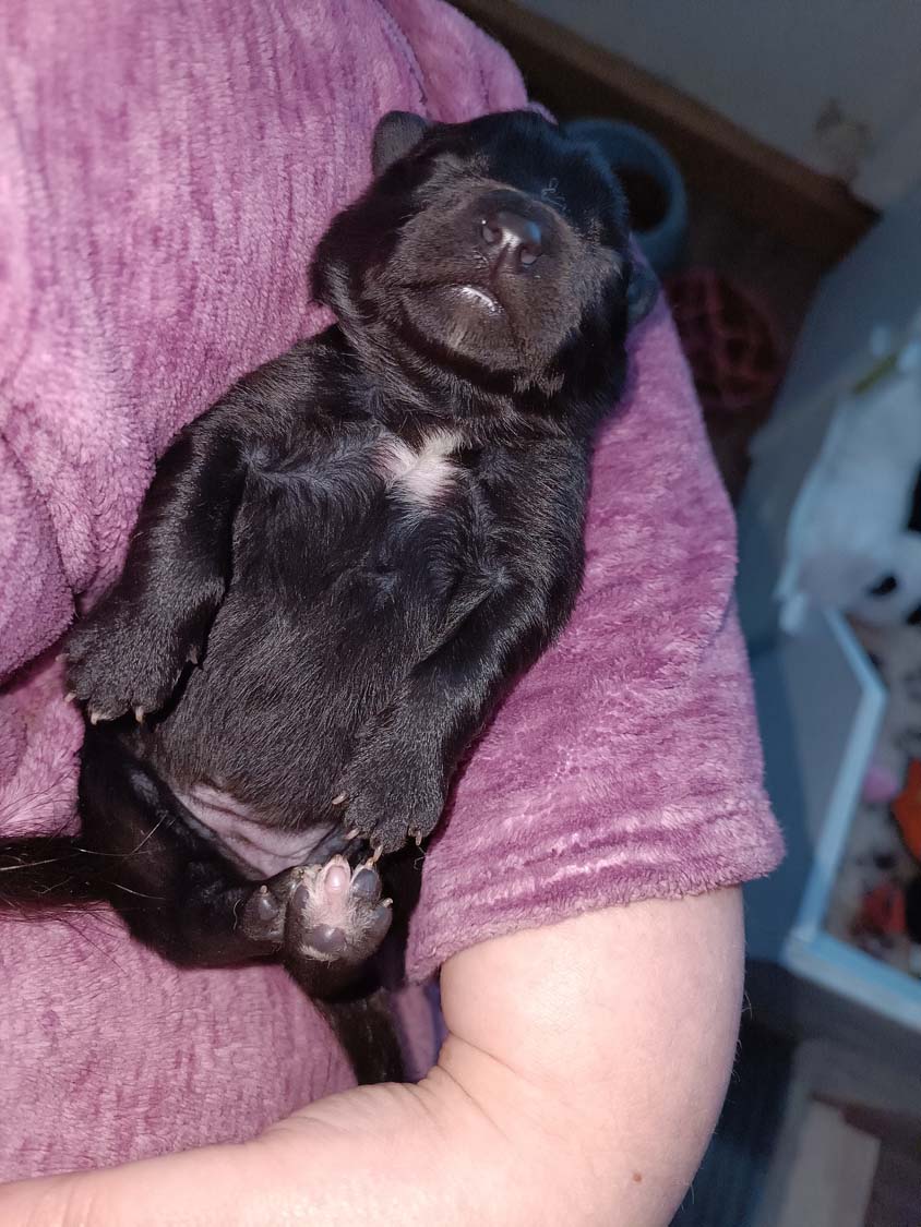 Bei der 3. Hündin bin ich mir noch nicht sicher welche Farbe sie mal haben wird. Ich denke schwarz, die Besitzerin vom Deckrüden meint sie erkenne ganz dezente Tan-Abzeichen. Ich sehe sie nicht wirklich, ich könnte theoretisch einen Gen-Test machen, dauert etwa 4-5 Wochen, bis dahin vermute ich aber dass wenn es wirklich tan abzeichen sind, sie deutlicher werden. Diese Abzeichen bilden sich auch erst innerhalb des ersten Lebensjahres richtig aus.
