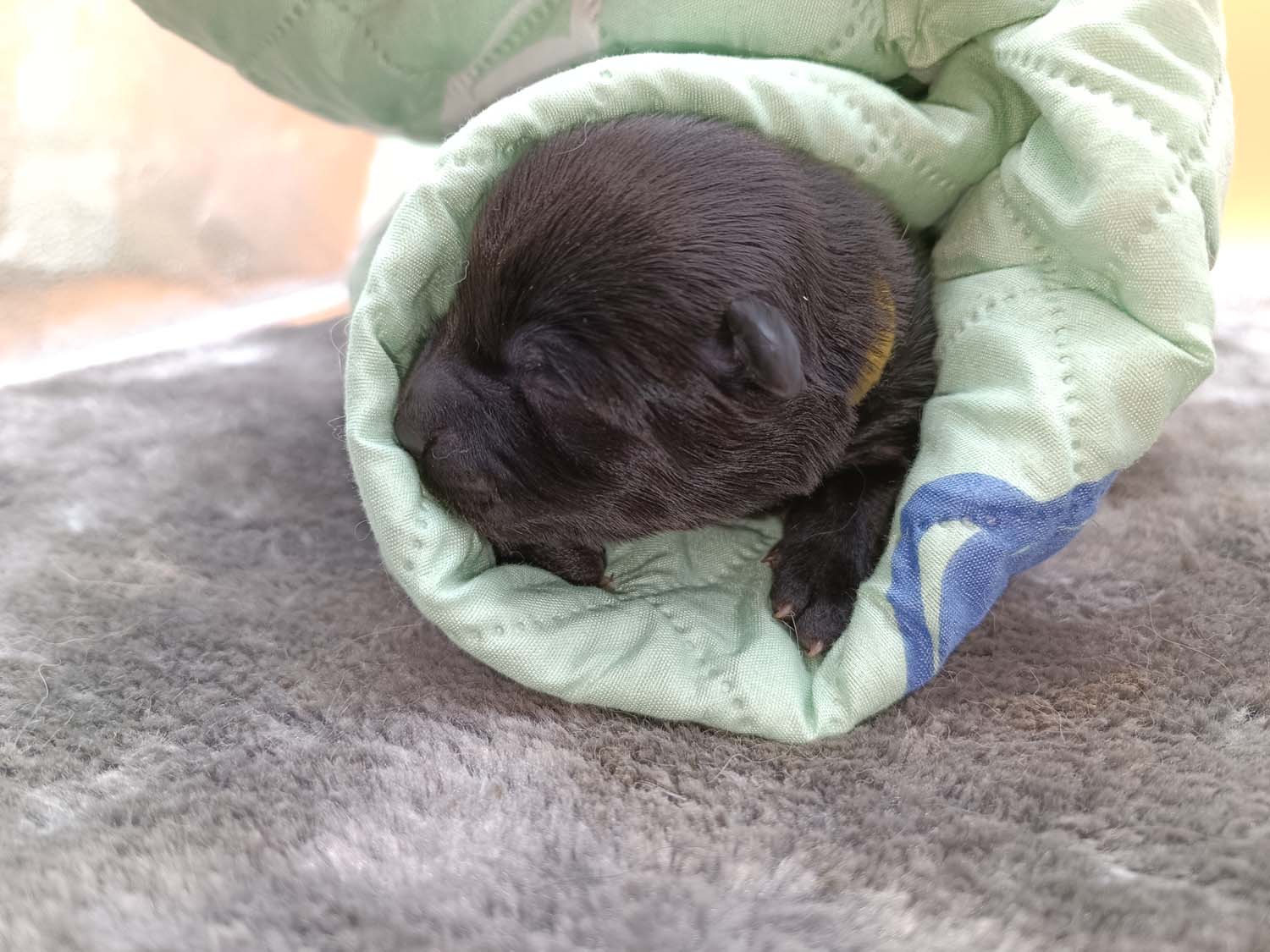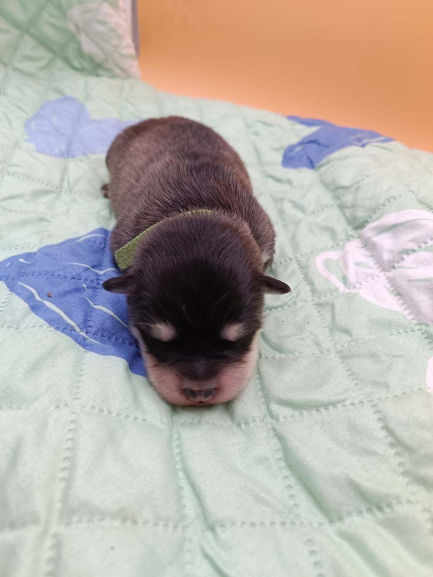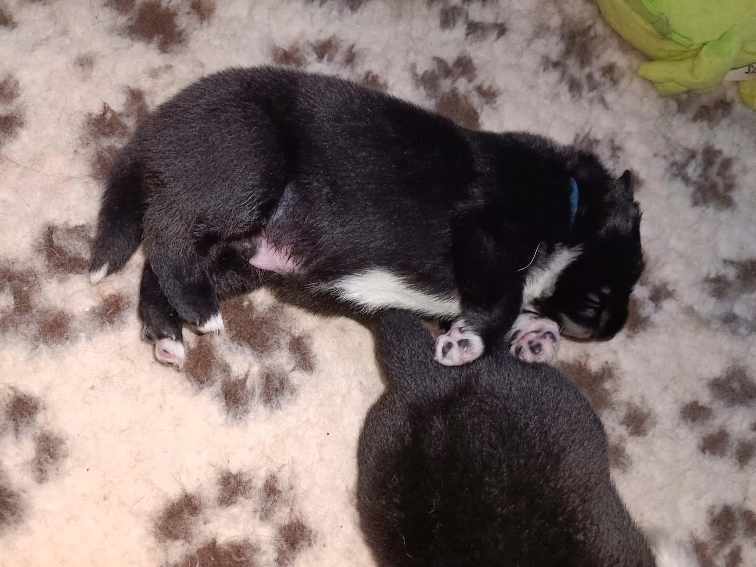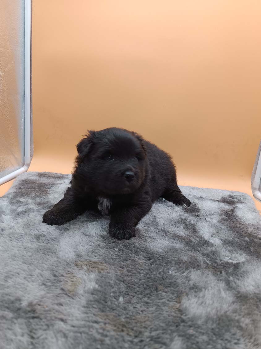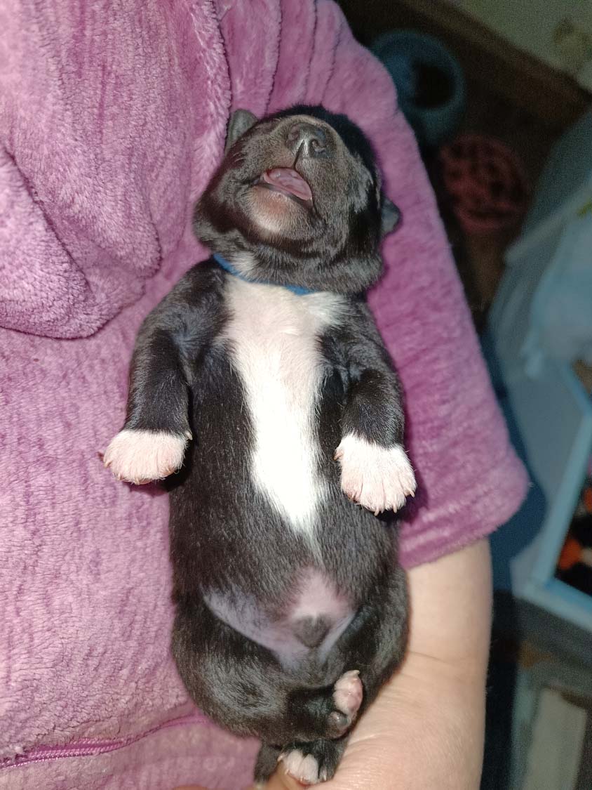 Bei der 3. Hündin bin ich mir noch nicht sicher welche Farbe sie mal haben wird. Ich denke schwarz, die Besitzerin vom Deckrüden meint sie erkenne ganz dezente Tan-Abzeichen. Ich sehe sie nicht wirklich, ich könnte theoretisch einen Gen-Test machen, dauert etwa 4-5 Wochen, bis dahin vermute ich aber dass wenn es wirklich tan abzeichen sind, sie deutlicher werden. Diese Abzeichen bilden sich auch erst innerhalb des ersten Lebensjahres richtig aus.
