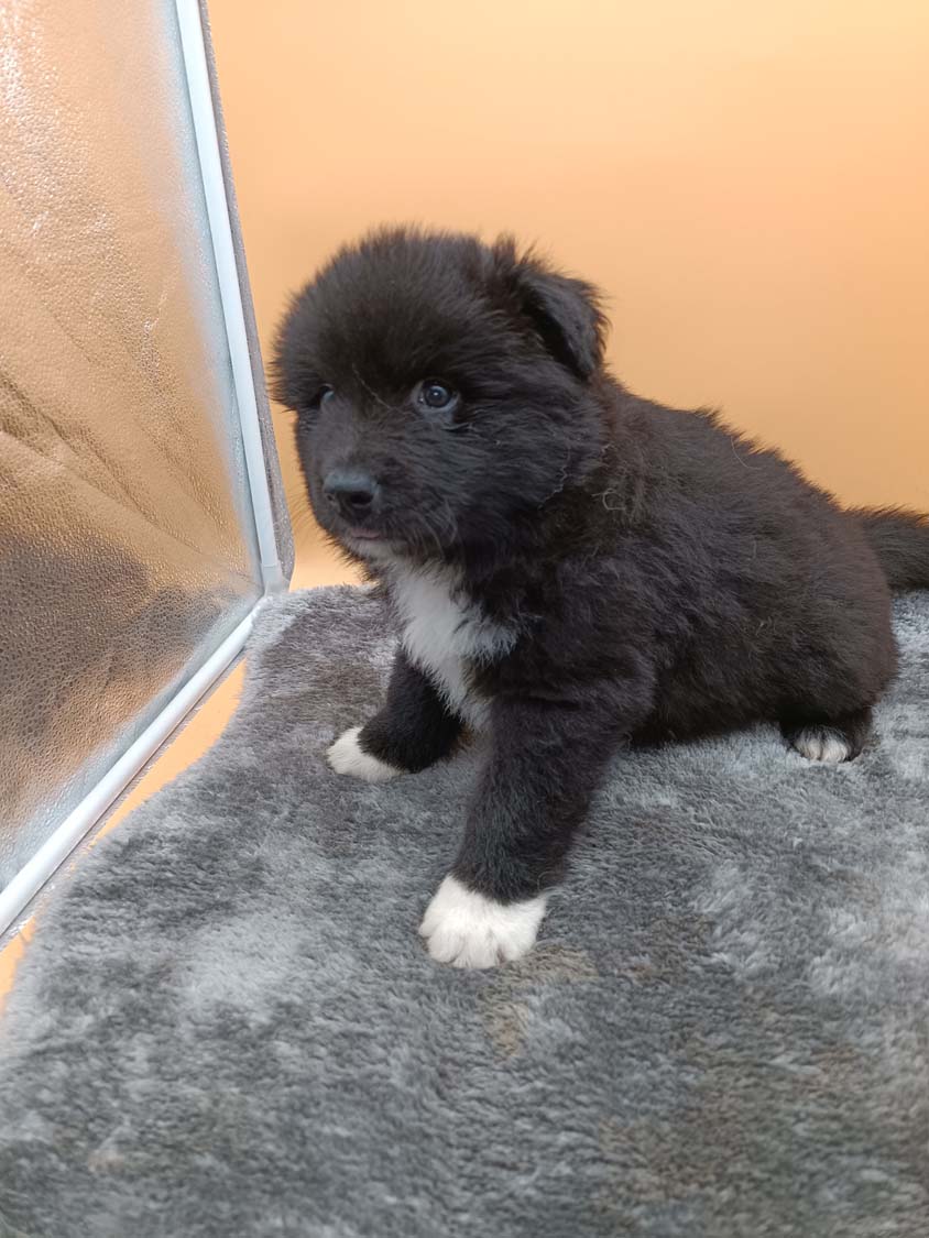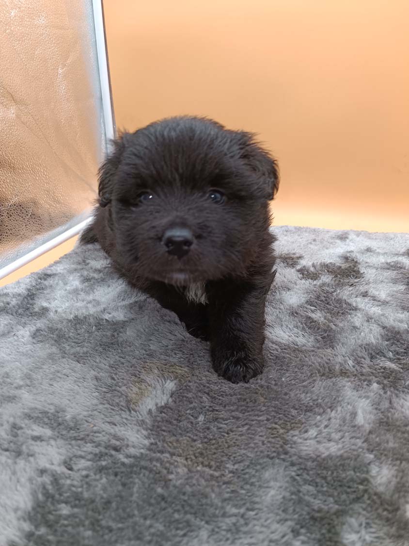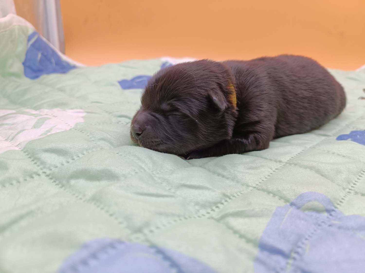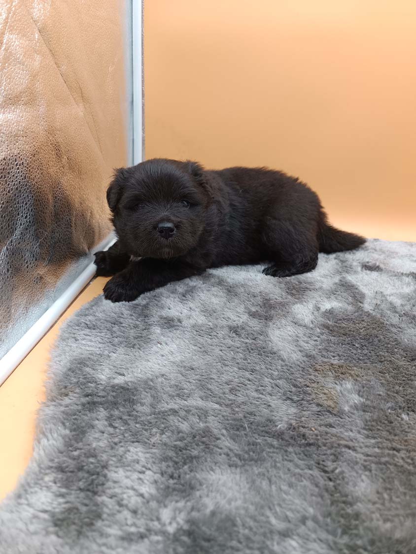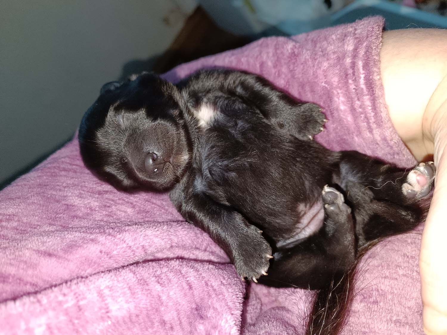 Bei der 3. Hündin bin ich mir noch nicht sicher welche Farbe sie mal haben wird. Ich denke schwarz, die Besitzerin vom Deckrüden meint sie erkenne ganz dezente Tan-Abzeichen. Ich sehe sie nicht wirklich, ich könnte theoretisch einen Gen-Test machen, dauert etwa 4-5 Wochen, bis dahin vermute ich aber dass wenn es wirklich tan abzeichen sind, sie deutlicher werden. Diese Abzeichen bilden sich auch erst innerhalb des ersten Lebensjahres richtig aus.