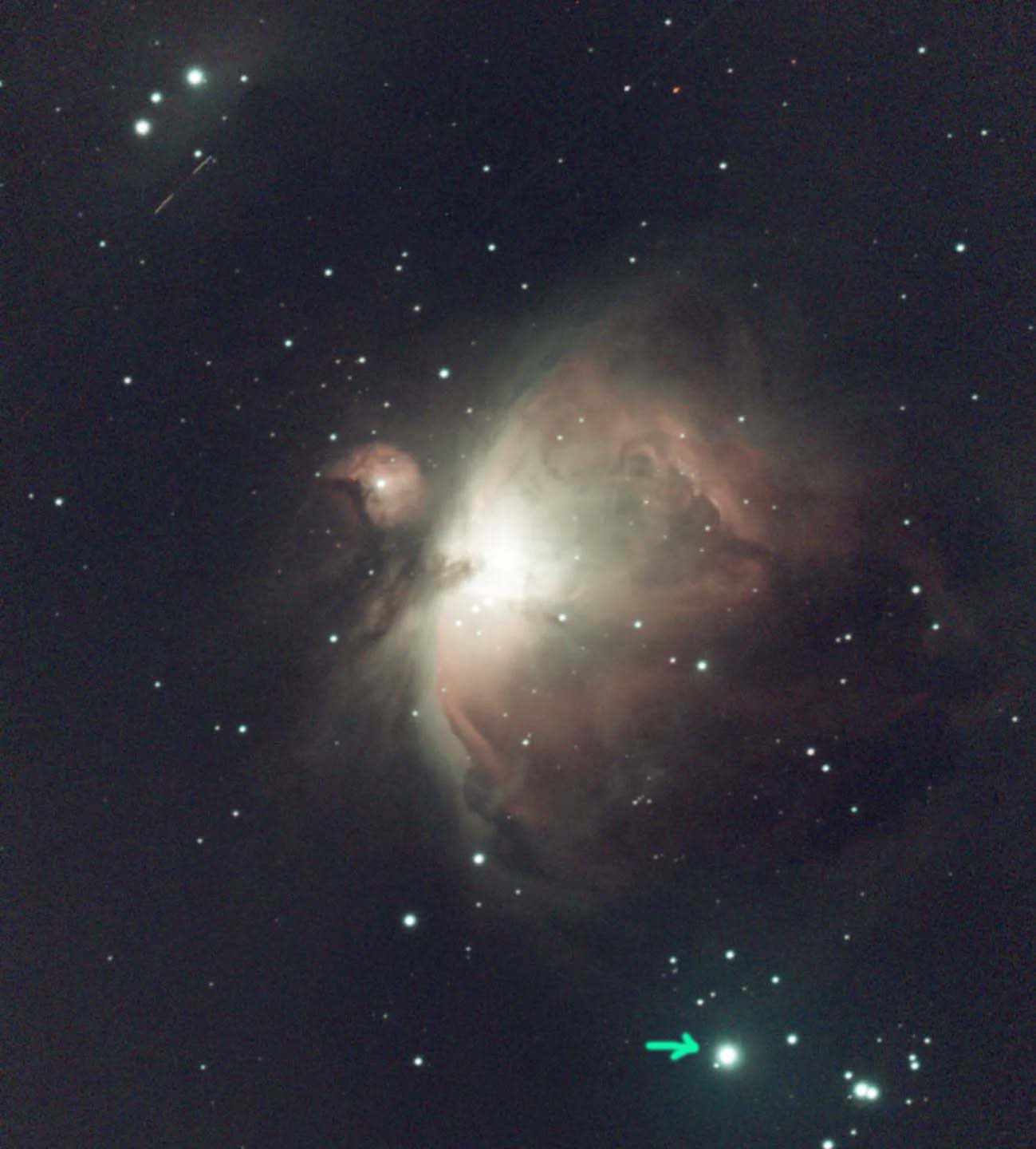 Hündin 2 - Hatysa (Nair Al Saif ist der Eigenname des Sterns Iota Orionis, DMG Nair as-Saif ‚Der Helle im Schwert‘) auch bekannt unter dem Namen Hatysa. Der Stern steht 5° südlich des Oriongürtels und 0,5° südlich des Orionnebels (M42). Das erste Bild, ist ein Bild vom Orionnebel und der Pfeil zeigt auf den Stern.) - domino