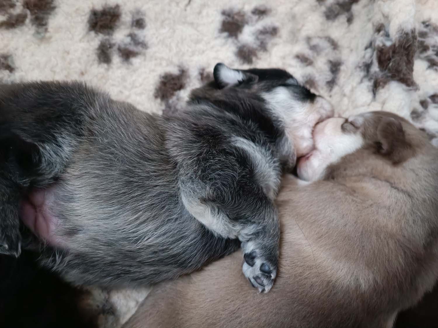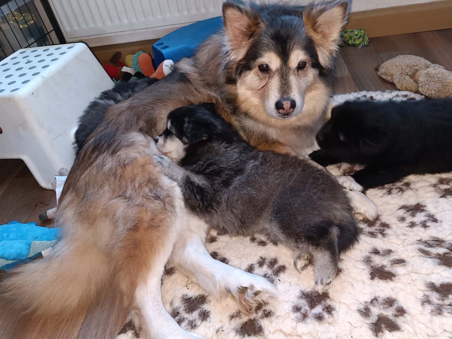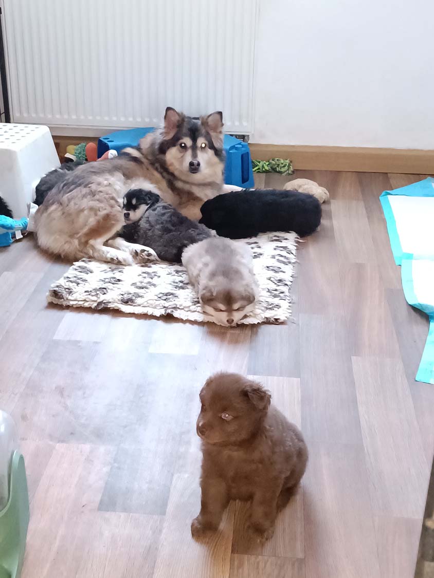 Nachdem Hexe die ersten Tage sehr zickig unterwegs war, bin ich am Montag zur Tierärztin gefahren, um den Calcium-Wert bestimmen zu lassen. Manchmal kann es durch einen niedrigen Calciumwert zu Zickigkeit kommen, der war aber im Normbereich und die letzten beiden Tage ist sie auch etwas ruhiger geworden. Zickt zwar die anderen Hunde trotzdem noch an, aber nimmt sich nun auch mal 5min Auszeit und kommt zum kuscheln. Allerdings ich gebe es zu, man möchte nicht unbedingt von ihr momentan angehechelt werden. Das Putzen der Kleinen hinterlässt einen etwas intensiven Atem. Solange die Welpen ruhig sind, kann ich auch nun die Welpen aus der Wurfbox nehmen, ohne das Hexe sofort hinterher springt. Diese drei, sind meine Genießer, und beim Bauchkraulen direkt mal eingeschlafen. Die drei Dominos waren da nicht ganz so ruhig und das verursacht, dann doch noch Stress bei Hexe.
