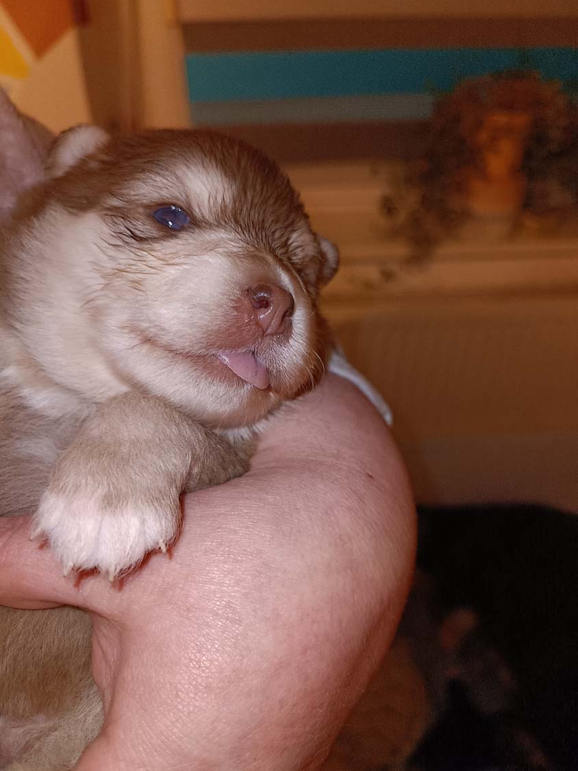 Hexe hat eindeutig Sahne in der Milchbar, die Zwerge sind zu kleinen Robben herangewachsen. Alle haben mehr oder weniger die Augen nun geöffnet und versuchen sich auf ihre Beinchen zu stemmen. Allerdings stimmen die Proportionen noch nicht so wirklich und das Laufen funktioniert noch nicht wirklich. Es werden auch erste Spielversuche gestartet, meist noch in liegen. Ich hab die letzten Tage die Welpen eher wenig aus der Wurfbox genommen und das Zimmer auch relativ abgedunkelt, so dass die Umstellung nicht so extrem ist. Man merkt auch, dass einige Welpen schon bereits etwas zusammenzucken bei einen lauten Geräusch, sprich auch das Hören entwickelt sich nun mehr von Tage zu Tag, noch sind die Ohrkanäle geschlossen, das dauert in der Regel so bis zur 3 Wochen.