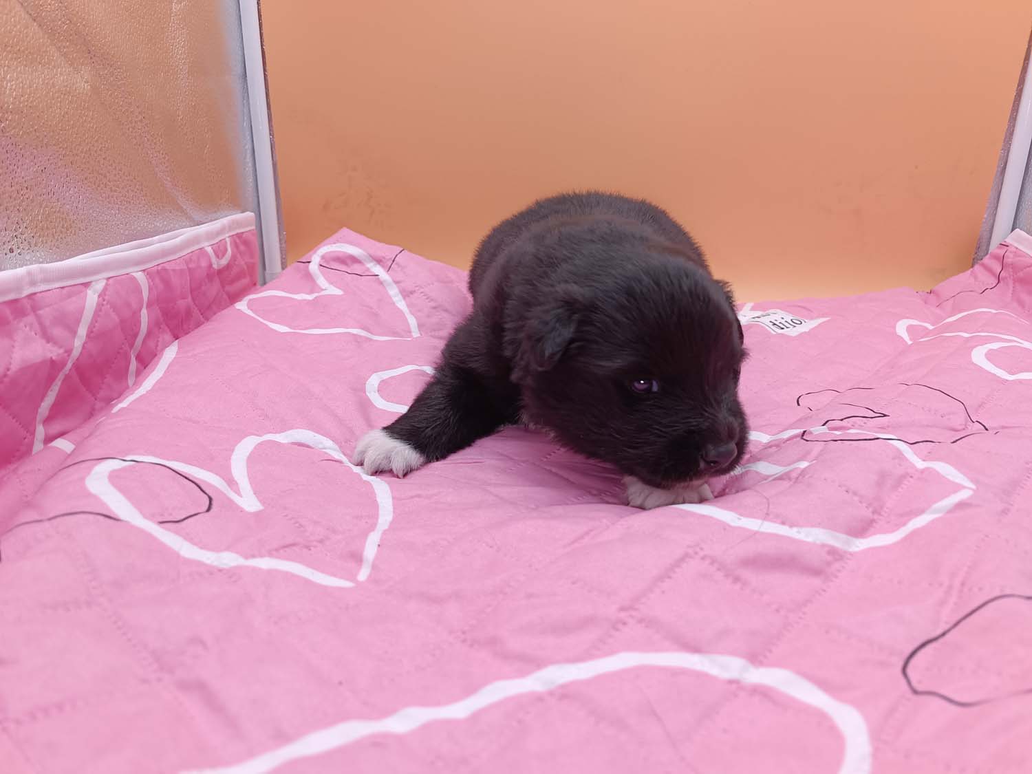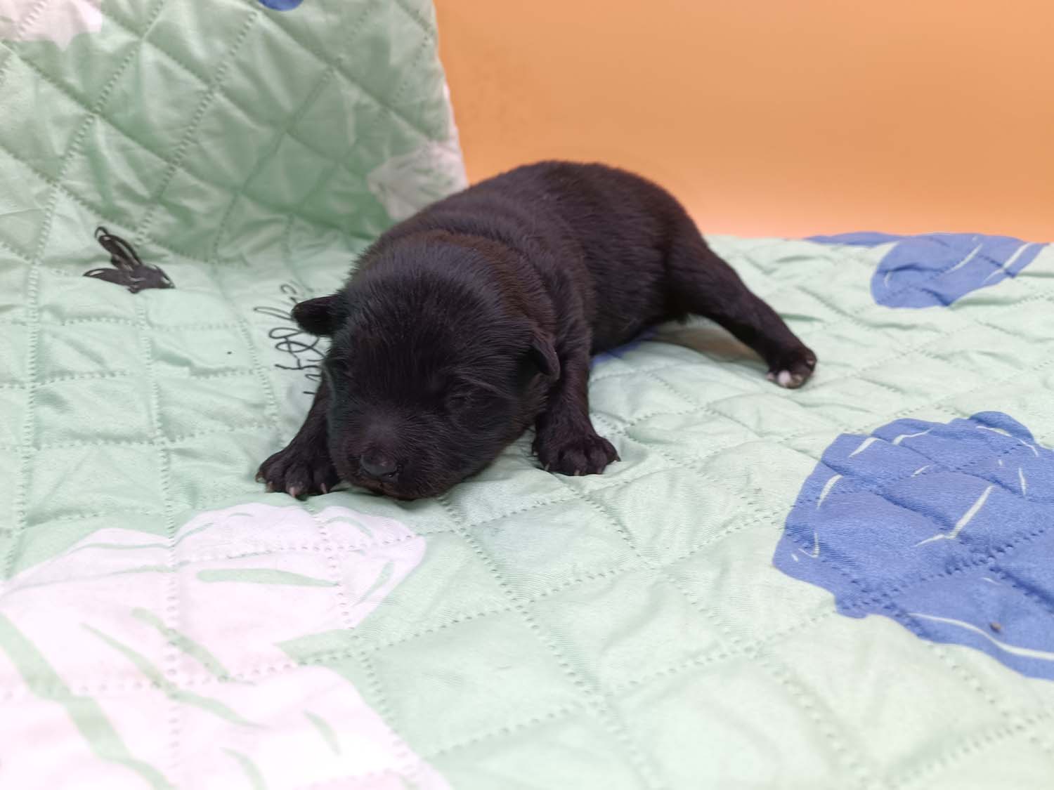 Bei der 3. Hündin bin ich mir noch nicht sicher welche Farbe sie mal haben wird. Ich denke schwarz, die Besitzerin vom Deckrüden meint sie erkenne ganz dezente Tan-Abzeichen. Ich sehe sie nicht wirklich, ich könnte theoretisch einen Gen-Test machen, dauert etwa 4-5 Wochen, bis dahin vermute ich aber dass wenn es wirklich tan abzeichen sind, sie deutlicher werden. Diese Abzeichen bilden sich auch erst innerhalb des ersten Lebensjahres richtig aus.