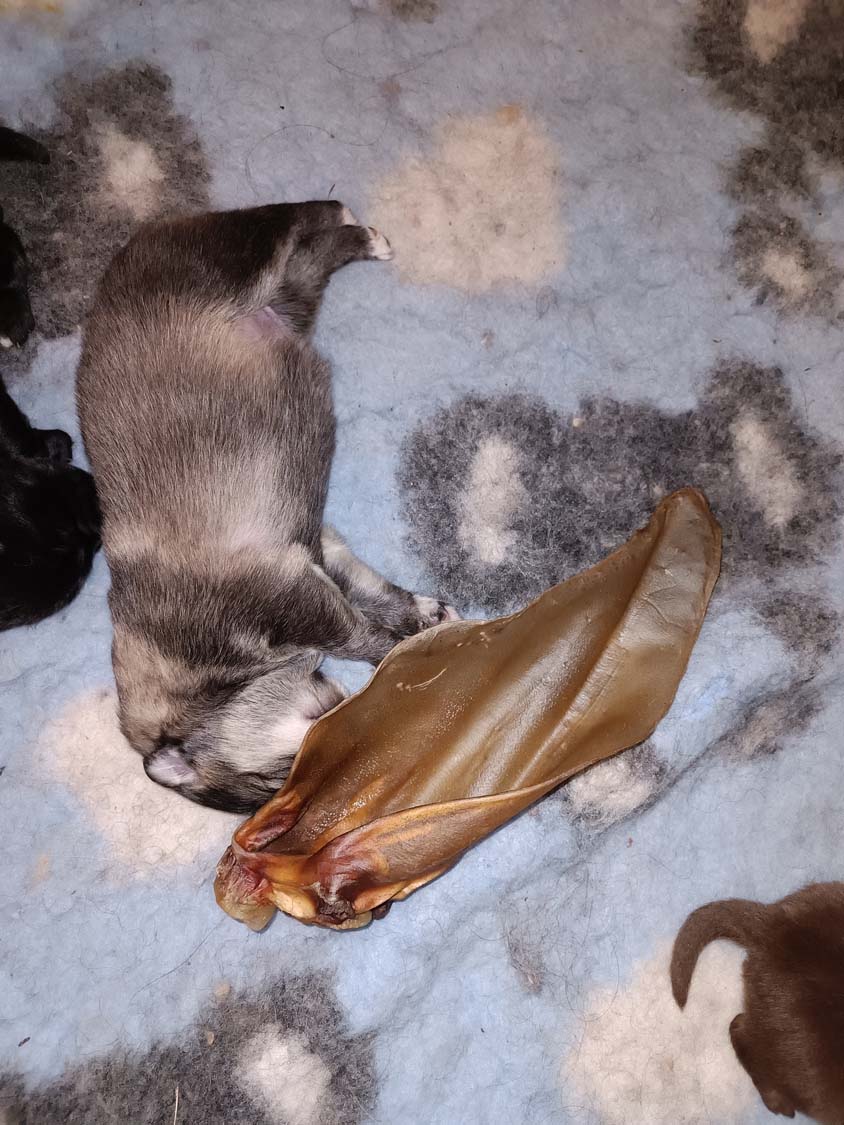 Kurze Story. Am Freitag, hatte ich den Großen Rinderohren zum knabbern gegeben. Hexe hat sich erst eins geholt, kam dann aber wieder und wollte noch ein zweites. Hexe bekommt was sie möchte, also hab ich ihr ein zweites Rinderohr gegeben. Das sie dann in die Wurfbox geschafft hat. Nur leider wissen die Zwerge noch nichts damit anzufangen und als Kuschelkissen ist es nicht ganz so geeignet. Am nächsten Tag war Hexis Appetit dann aber doch zu groß und sie hat es selbst geknabbert.