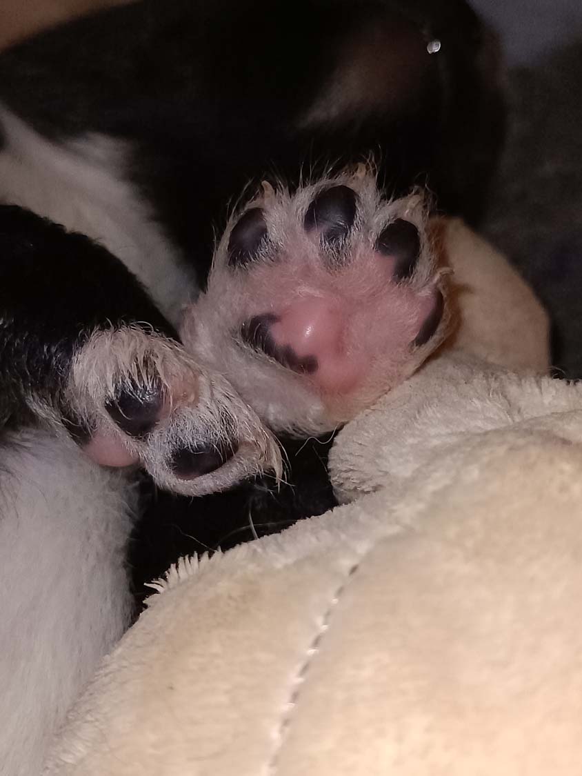 Nachdem Hexe die ersten Tage sehr zickig unterwegs war, bin ich am Montag zur Tierärztin gefahren, um den Calcium-Wert bestimmen zu lassen. Manchmal kann es durch einen niedrigen Calciumwert zu Zickigkeit kommen, der war aber im Normbereich und die letzten beiden Tage ist sie auch etwas ruhiger geworden. Zickt zwar die anderen Hunde trotzdem noch an, aber nimmt sich nun auch mal 5min Auszeit und kommt zum kuscheln. Allerdings ich gebe es zu, man möchte nicht unbedingt von ihr momentan angehechelt werden. Das Putzen der Kleinen hinterlässt einen etwas intensiven Atem. Solange die Welpen ruhig sind, kann ich auch nun die Welpen aus der Wurfbox nehmen, ohne das Hexe sofort hinterher springt. Diese drei, sind meine Genießer, und beim Bauchkraulen direkt mal eingeschlafen. Die drei Dominos waren da nicht ganz so ruhig und das verursacht, dann doch noch Stress bei Hexe.