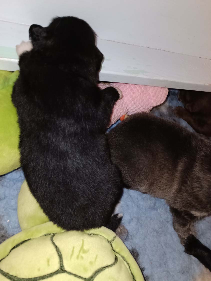 Ich bin gefragt worden warum ich die Welpen immer von außerhalb filme, denke nicht, dass jemand Interesse hat für 10min meine Füße und Bein zu betrachten ;). Die Welpen suchen nun immer mehr auch aktiv den Kontakt zu mir.